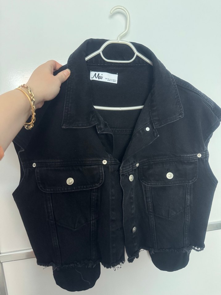 Siyah kolsuz denim ceket, düğmeli ve notched yaka detayına sahiptir. Rahat kesimi ve mini boyuyla günlük kullanıma uygun markasi MAİ