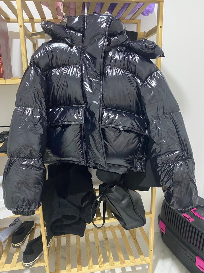 Parlak siyah kısa mont, kemerli ve yüksek yakalıdır. Burdan aldım büyük geldi iade kabuk edilmedigi için satıyorum. Arka kısmında ufak bir kesik var ve bazı izler ben hıc kullanmadım montu sanırım bana böyle geldi mont oversize bir model. Şapka kısmı fermuarlı takılıyor 50-60 kıloya uygun olucaktır