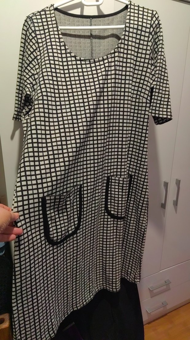 kareli elbise , kısa kollu ve yuvarlak yakalıdır. önü cepli, sentetik kumaştan günlük sokak stiline uygun.