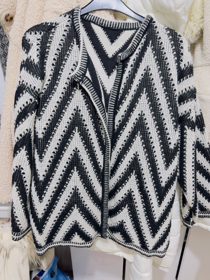 Siyah krem zebra desenli, uzun kollu kadın triko hırka. Normal kesim ve midi boyda, günlük kullanıma uygun.