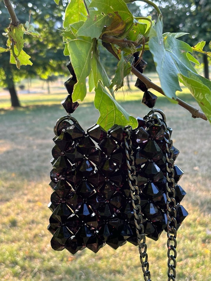 Siyah cam boncuklarla bezenmiş, yılan desenli gotik kadın çanta. Zincir askılı, dış mekan kullanımı için uygun ve avant-garde tarzda.