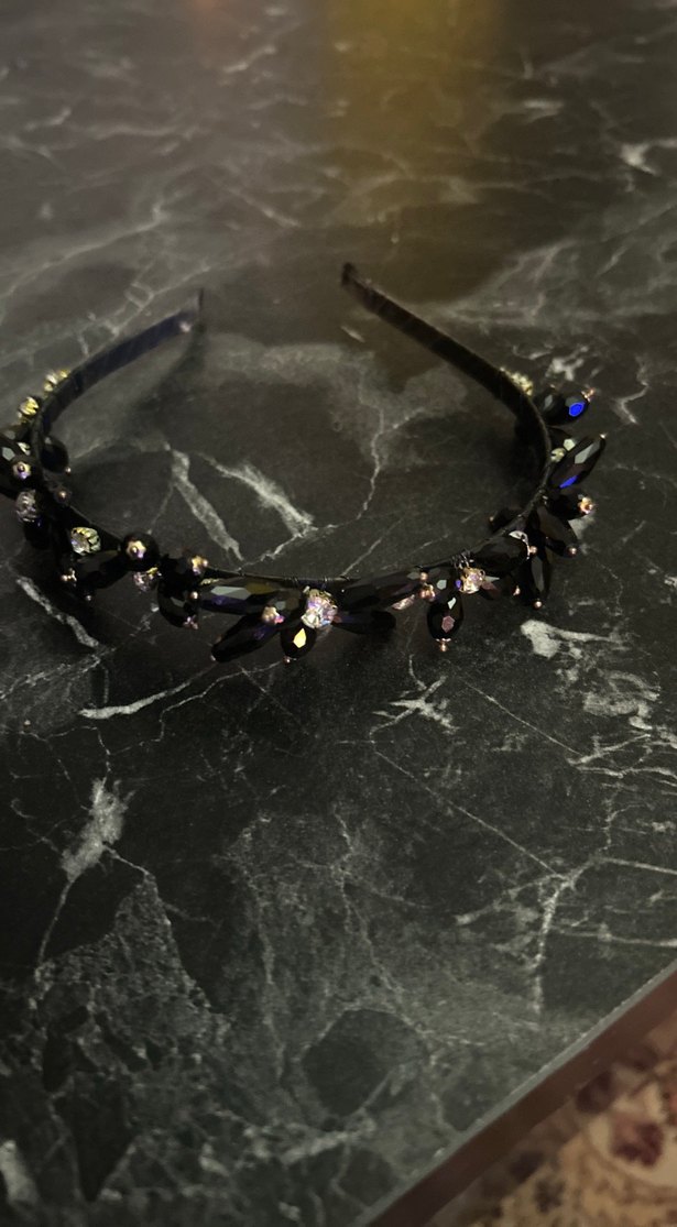 Siyah cam kristalleri ve payetlerle süslenmiş, göz alıcı gotik tarzda bir taç. ✨