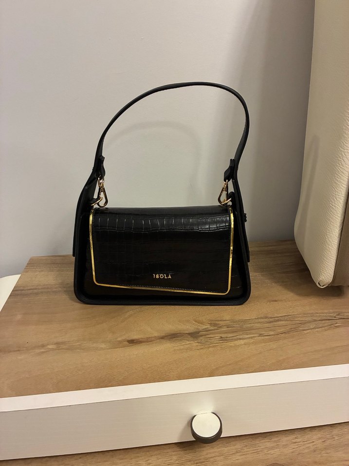 Siyah deri çanta, parlak kroko desenli ve tokalı detaylıdır. Modern klasik tarzıyla Paris şıklığını yansıtır.