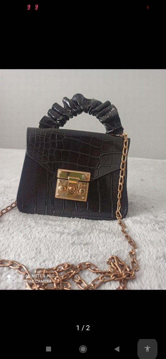 Siyah krokodil desenli deri kadın çantası, altın renkli tokalı kilit ve büzgülü kulp ile birlikte zincir askıya sahiptir. Klasik ve gotik tarzda, Paris esintili tasarım sunar.