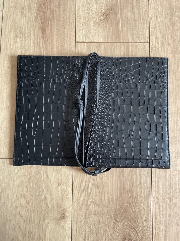 Krokodil derisi dokusuyla şık bir görünüm sunan siyah bir dosya çantasıdır. Düz, dikdörtgen formuyla modern ve minimalist bir tasarıma sahiptir. İç kısmında, kartvizit veya notluk gibi küçük eşyaları koymak için pratik bir bölme bulunur ve çanta, uzun bir kayışla omuzda veya çapraz olarak taşınabilir. Kayışın bağlanma şekli, ürüne özgün bir hava katıyor. Hem profesyonel hem de günlük kullanım için uygun olan bu dosya, belgelerinizi ve eşyalarınızı stil sahibi bir şekilde taşımanızı sağlar. Derisinde hiçbir çizilme veya defo yoktur. Kullanılmadı.