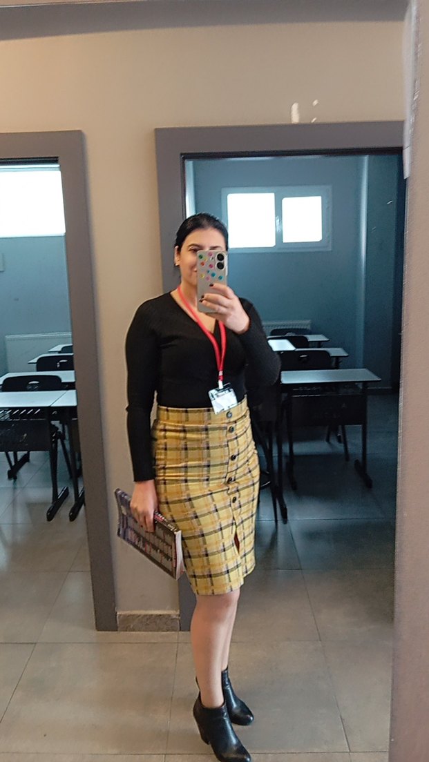 Siyah kruvaze yakalı uzun kollu bluz ve sarı ekose desenli, kemerli midi etekle ofis için trend bir casual stil sunar.