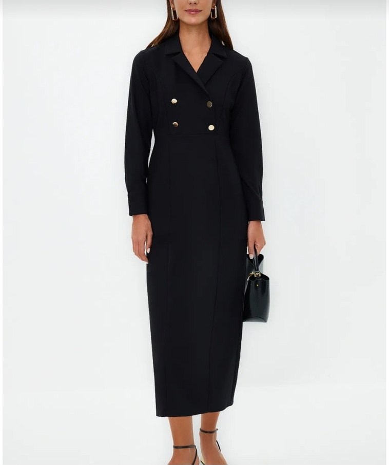 Siyah kruvaze yaka düğme detaylı dokuma elbise