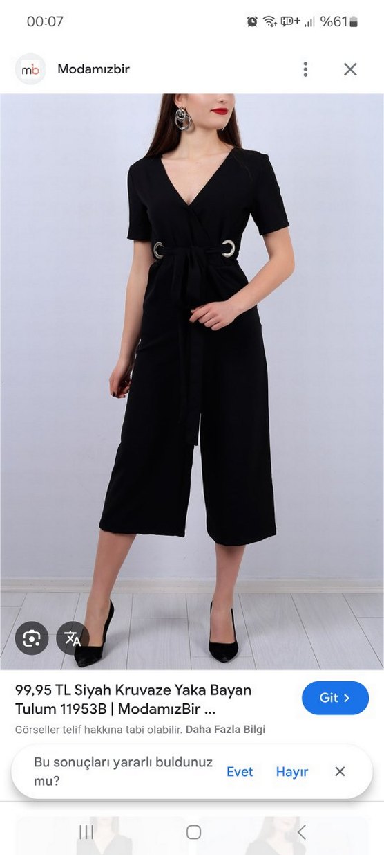 Çok az kullanılmış tertemiz M 38 beden kadın tulum... V yakalı, askılı kollu siyah tulum, kemerli ve regular fit kesimlidir. Ofis kullanımı için uygun, sentetik kumaştan yapılmıştır.
