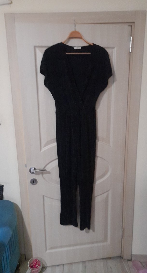 Kruvaze yaka ve pile detaylı siyah tulum. Sentetik kumaştan, gotik tarzı yansıtır. Romantik akşamlar için uygun. iki kol arasi 50 cm omuzdan paça bitimine 140 cm