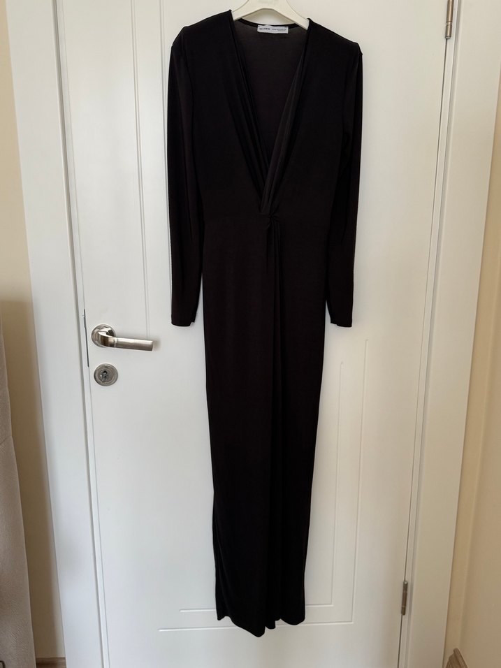 Uzun kollu, kruvaze yakalı ve dökümlü detaylı, siyah sentetik kumaştan yapılmış dar kesim uzun elbise. Giyildiğinde çok güzel duran, vatkalı bir butik elbisesi 1 kere giyildi.