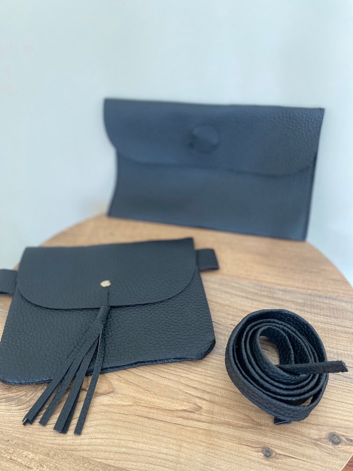 Siyah renkli iki tane deri çanta ya da cüzdan olarak kullanılabilinir.. birinin sapı var ister bağlayarak ister dikerek sapı monte edilerek kullanılabilinir. ikisi de çıtçıtlıdır hiç kullanılmadı etiketi yok yeni