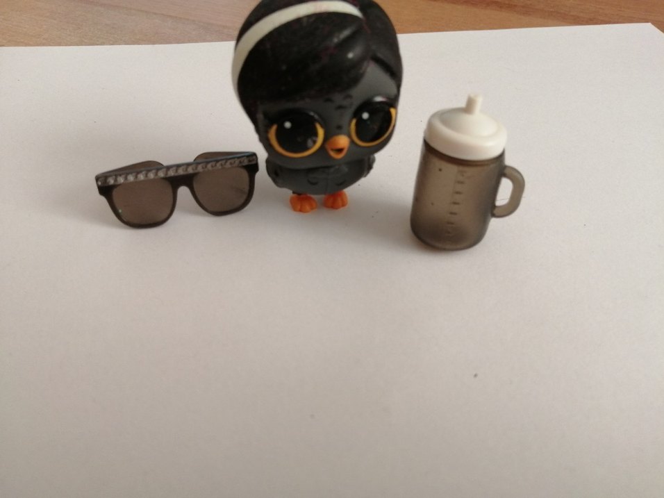 Beyaz bantlı siyah küçük kuş lol bebek, yanında şeffaf biberon ve kahverengi güneş gözlüğü ile birlikte.