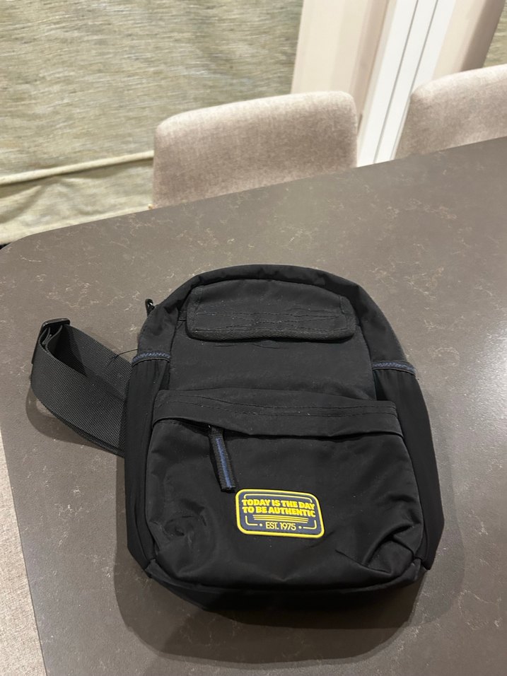 Siyah renkte, kemerli tasarıma sahip erkek omuz çantası. Önünde küçük bir etiket var, sokak ve rock punk tarzına uygun.