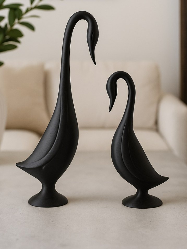 İki adet siyah kuğu figürü, uzun boyunlu ve mat yüzeyli, dekor için uygun.
