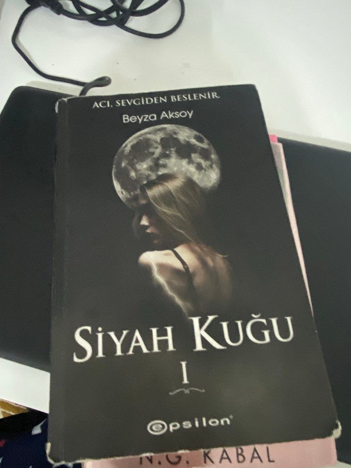 Beyza Aksoy'un "Siyah Kuğu I" adlı romanı, acı ve sevgiyi konu alıyor. Kapakta ay ve kadın görseli bulunuyor. Epsilon yayınevi.