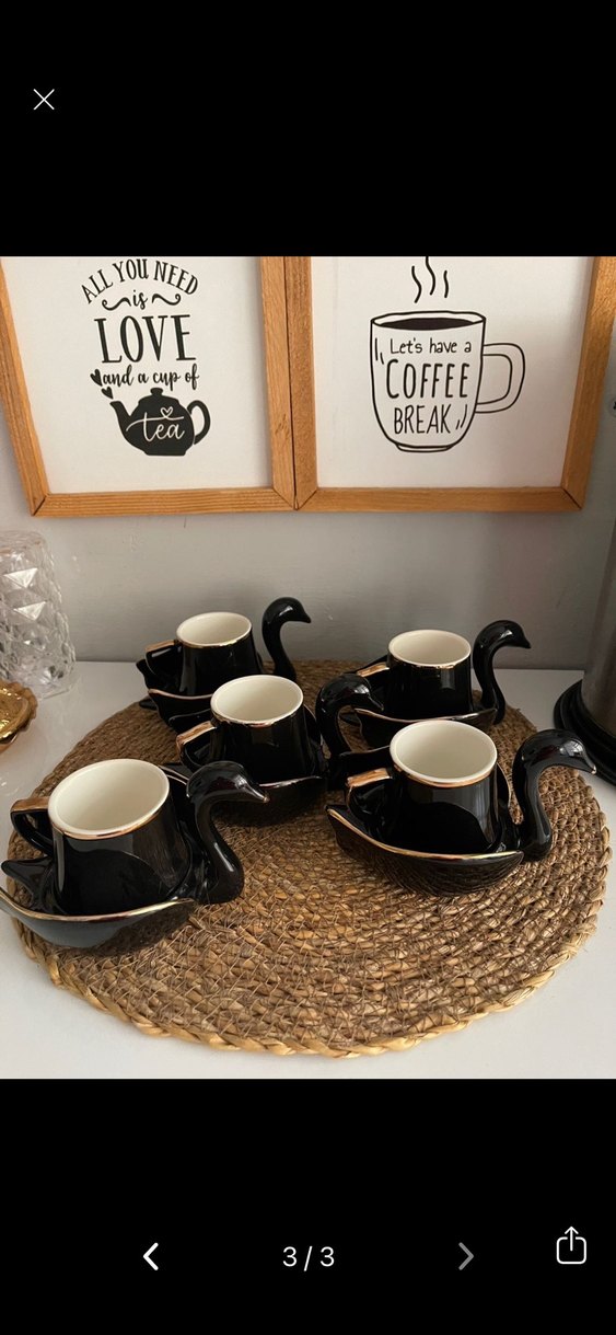 Paket açarken bi tanesi kırıldı . 5 adet Parlak siyah kuğu şeklinde kahve fincanları ve tabaklardan oluşan şık bir set. Kahve sunumunuza zarafet katıyor. ☕