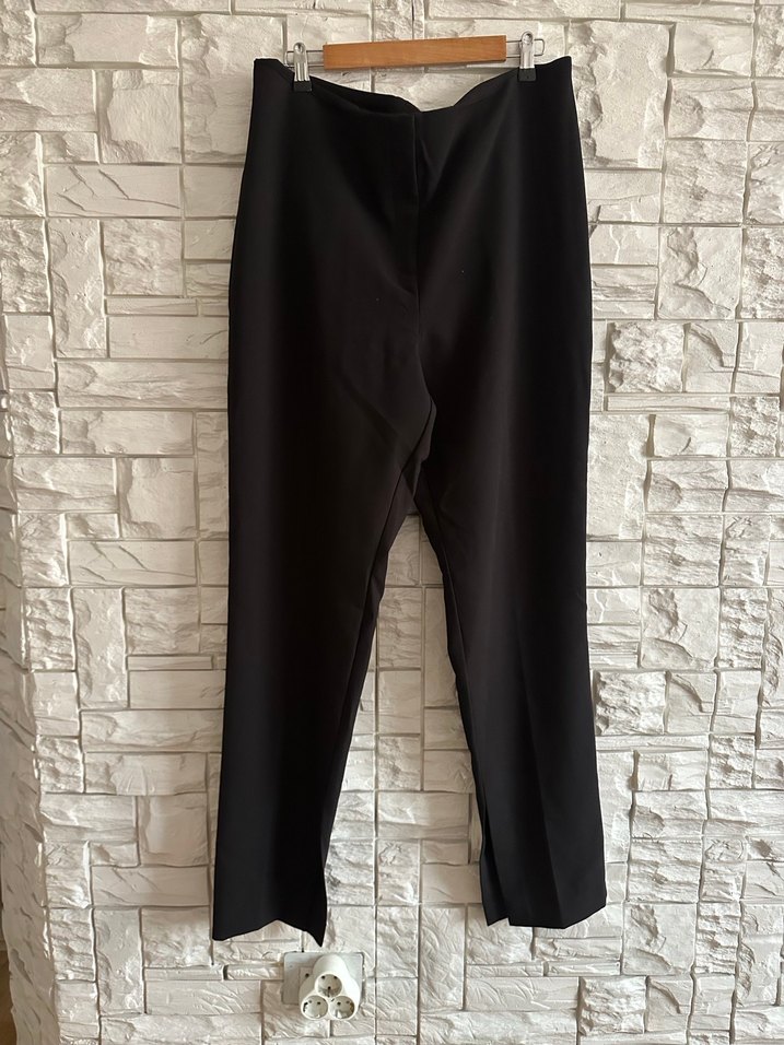 Düz siyah, rahat kesim kadın pantolon, yumuşak sentetik kumaştan, ofis ve günlük kullanıma uygun.