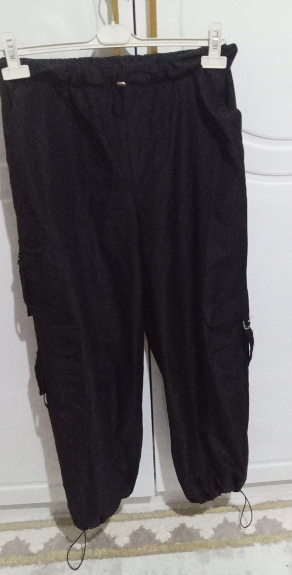 Siyah paraşüt pantolon, bol kesim ve belden ve bileklerden sıkmalı ayarlanabilir midi boy pantolon. Dış mekanlar için uygun, desen içermeyen rahat tasarım.iki kez giyildi