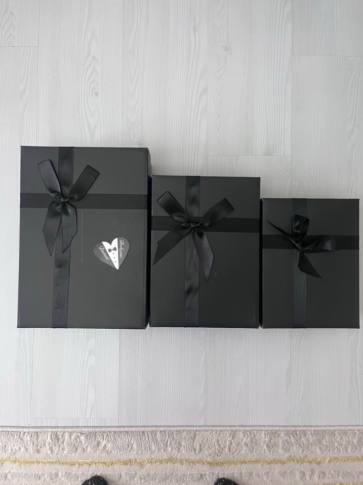 Üzerinde siyah saten kurdeleler bulunan, biri smokin kalp detaylı üç siyah hediye kutusu seti . Üzerinde birkaç yerinde ufak çizikler var onun dışında hiçbir sorunu yoktur.