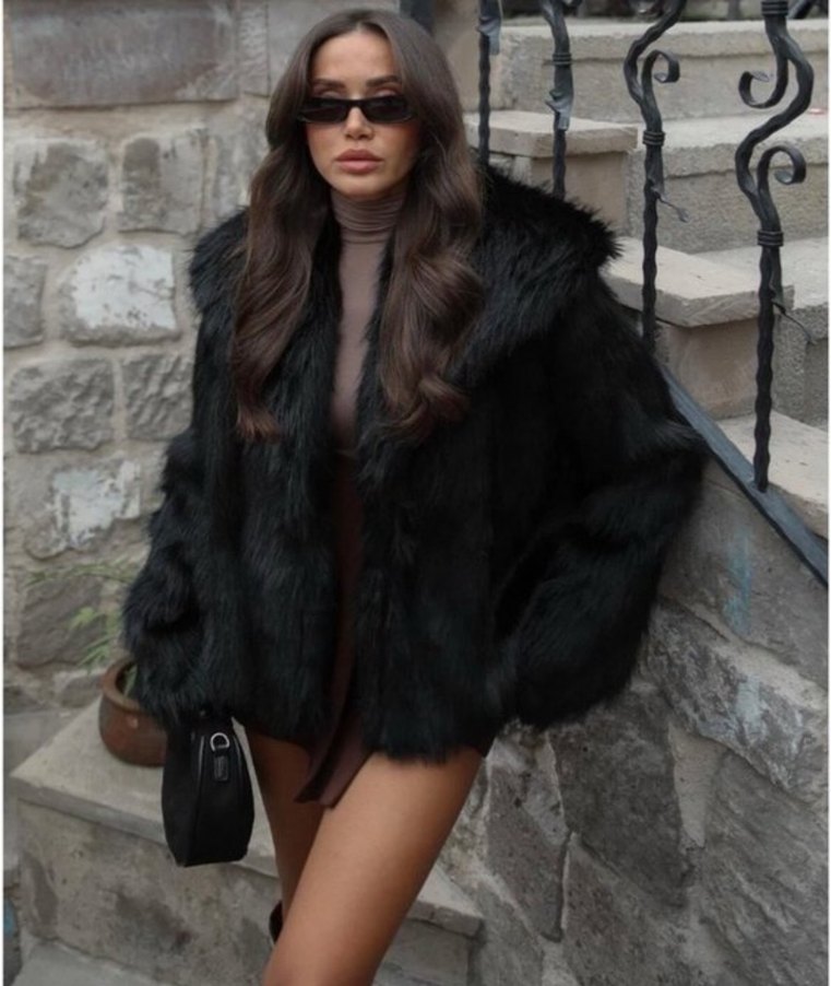 Uzun kollu, keskin yakalı ve kürklü detaylı siyah mini deri ceket. Sade desensiz, rahat ve gotik tarzda, vücuda oturan kesime sahip.