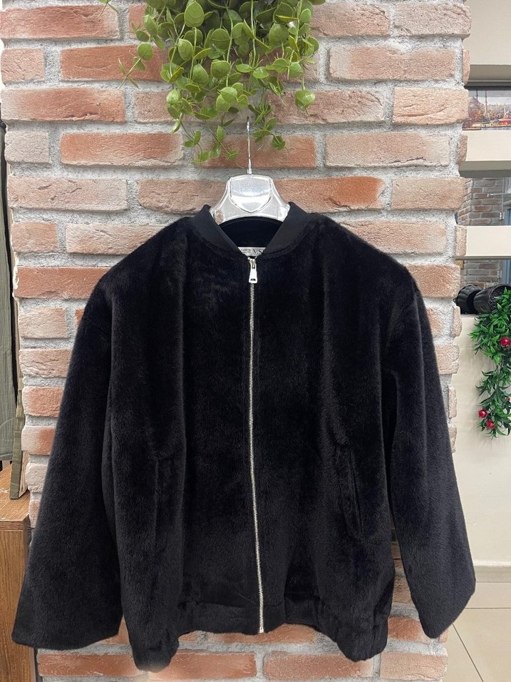 Yumuşak kumaştan, kürk detaylı siyah bomber mont. Yüksek yaka ve uzun kollu, rahat kesimiyle günlük kullanıma uygun.