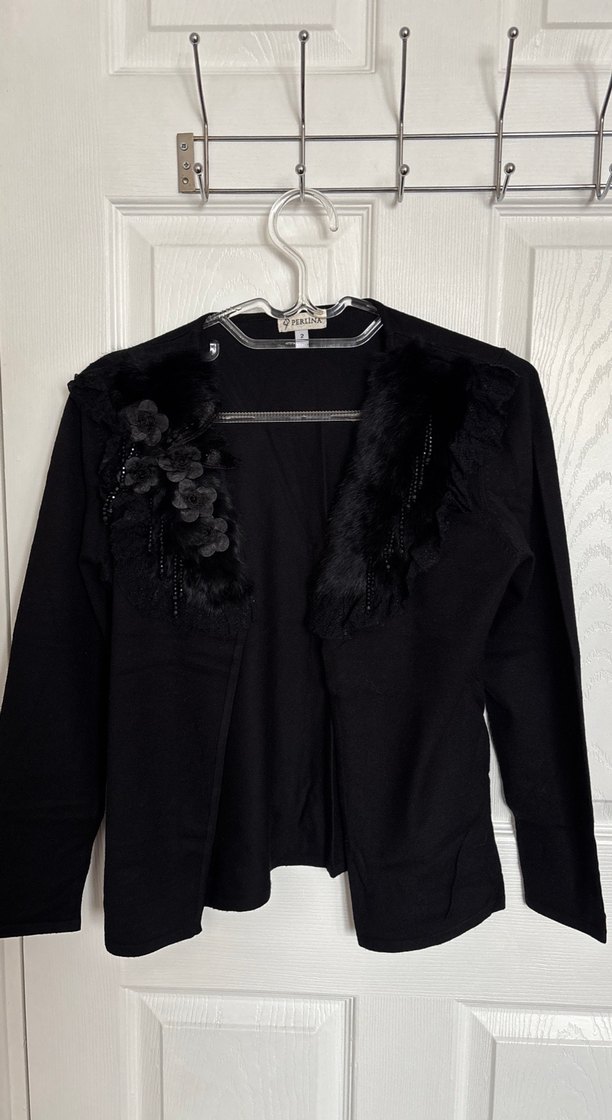 Uzun kollu, siyah, kürk detaylı, notched lapel yaka ve midi boyda gotik tarzda kadın hırka. Yumuşak ve sıcak kumaştan üretilmiştir. kanca kısmı sıkıntılı alındığında da böyleymiş