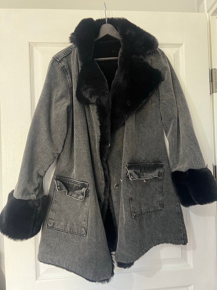 Siyah kürk detaylı, normal uzunlukta gri denim ceket. Notlu yaka ve uzun kollu, rahat kesim ile günlük sokak stiline uygun. Not: çift taraflı giyilebilir hem kot mont hem pelus mont şeklinde