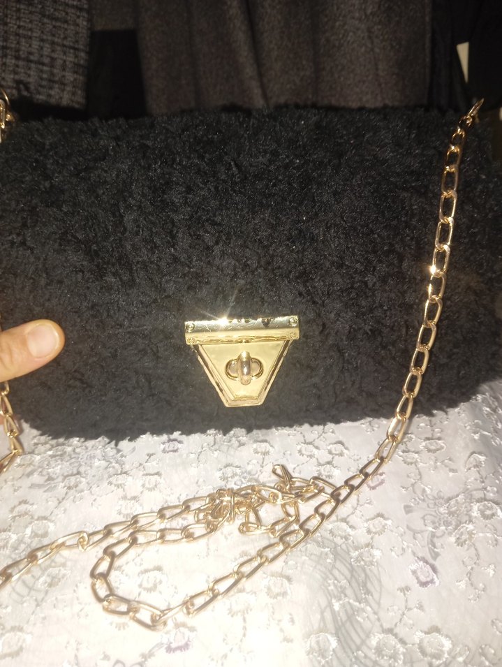 Yumuşak, kürk detaylı siyah sentetik kumaştan yapılmış, altın renk zincir askılı kadın çantasıdır. Rahat ve gotik tarzı bir araya getirir.