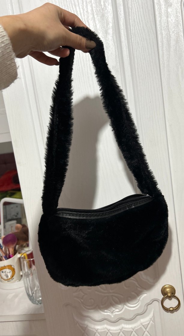 Siyah renkli, yumuşak sentetik kumaş ve kürk detaylı saplı kadın el çantasıdır. Günlük kullanıma uygun, desensiz ve gotik tarzda tasarlanmıştır.