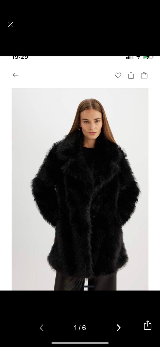 Bu siyah kadın kaban, bol kesim, peluş detaylar ve kesik yaka ile uzun kolludur. Orta boyda, yumuşak peluş kumaştan, rahat ve şık bir görünüm sunar.
