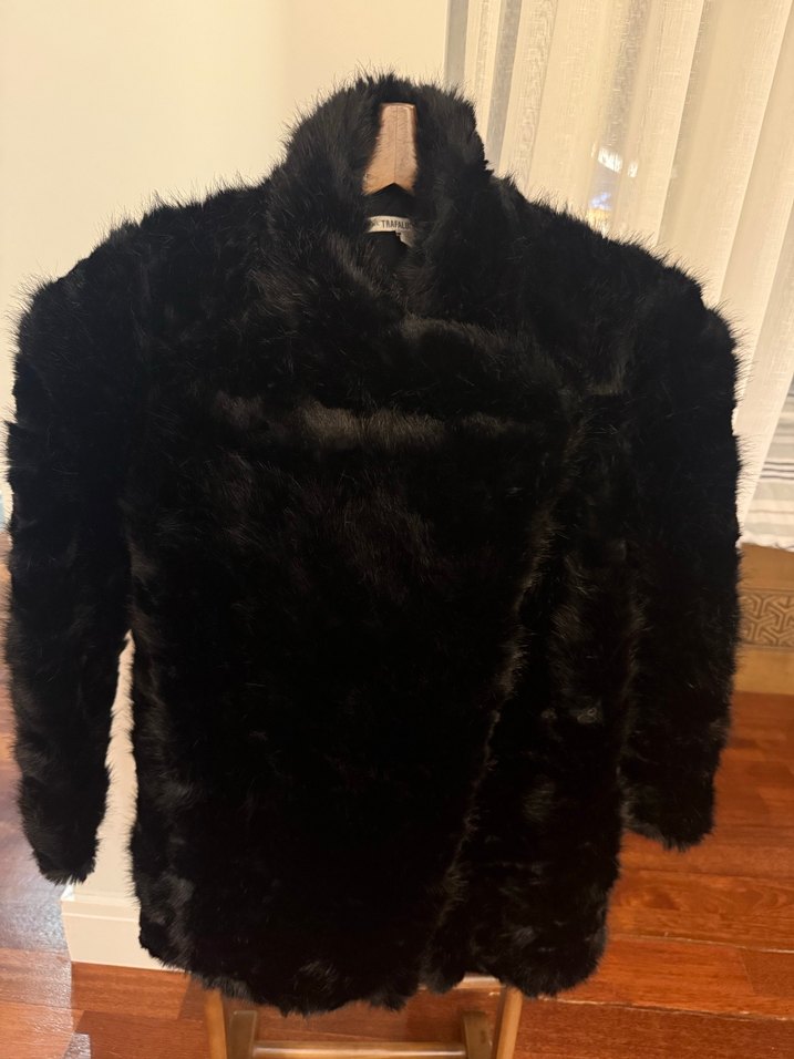 Siyah, kürk detaylı, yüksek yakalı ve uzun kollu kadın montu, rahat ve şık bir midi boyda tasarlanmıştır.