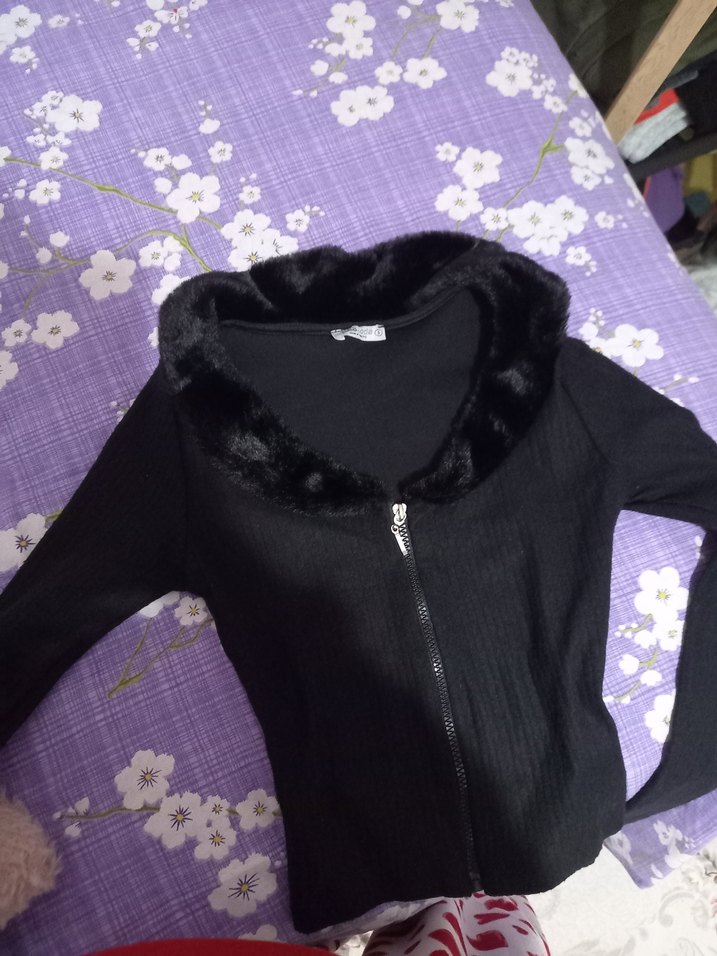 Siyah renkli, kürk detaylı yakası ve fermuarlı ön kısmı olan, uzun kollu, normal boyda, yumuşak ve sıcak dokulu kadın trikosudur. Rahat ve şık bir seçimdir.