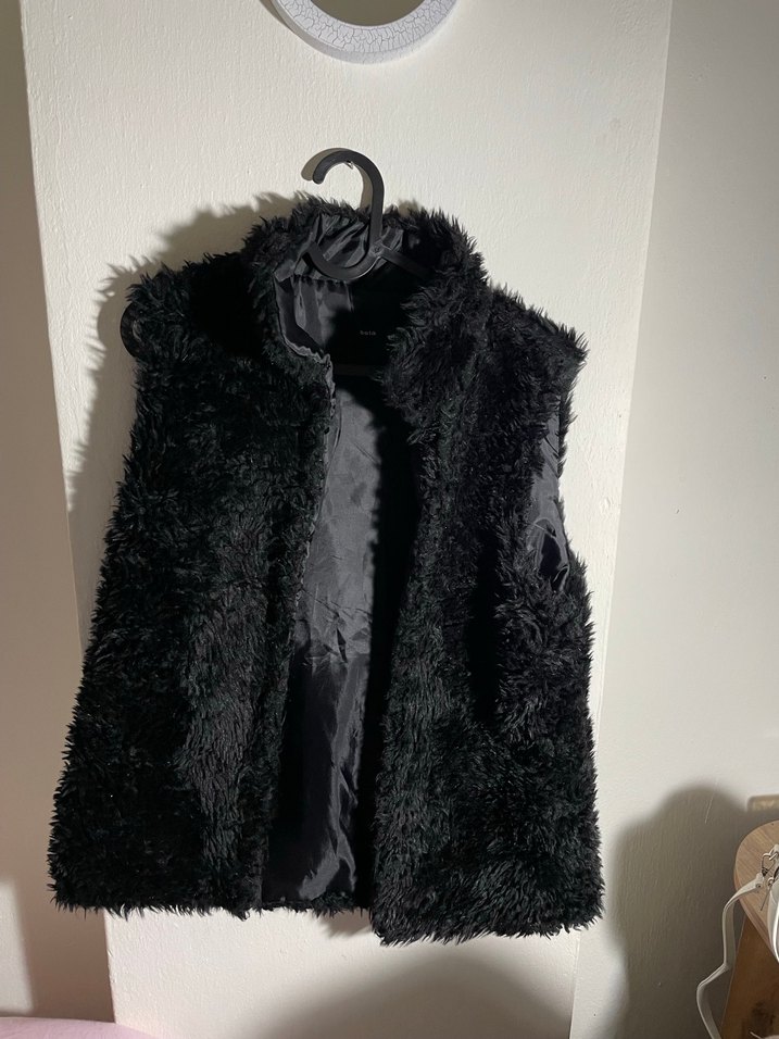 Siyah, kolsuz ve yüksek yakalı yelek, kürk detaylarıyla midi boyda rahat ve şık bir görünüm sunar. Günlük ve trend kombinlere uygundur.