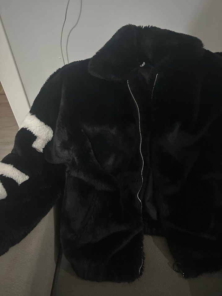 Siyah, kürk detaylı, uzun kollu ve fit kesim midi boy kadın mont. Yumuşak fleece kumaştan yapılmıştır ve günlük sokak stili için uygundur.