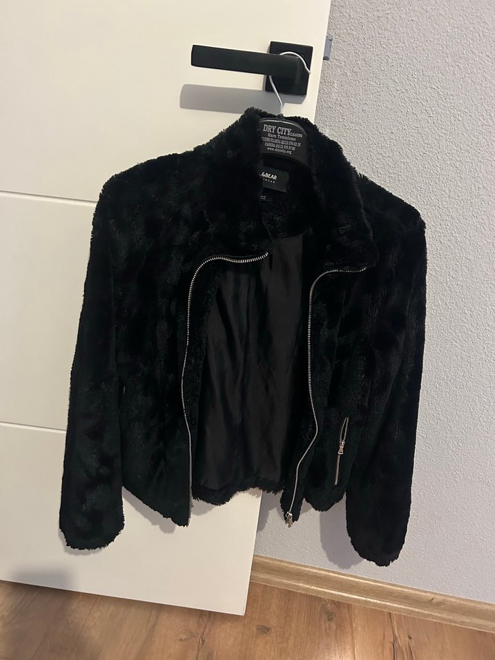 Siyah, kürk detaylı, uzun kollu ve yakalı bu fitted ceket, yumuşak fleece kumaştan üretilmiştir. Midi boyda, desensiz ve grunge punk tarzında bir sokak giyimi parçasıdır.