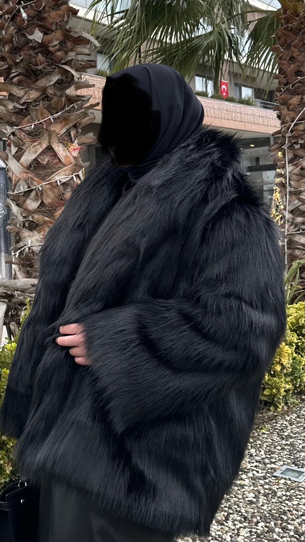 Siyah kürk detaylı, notched lapel yaka ve uzun kollu midi uzunlukta, bol kesim kadın kaban.Zengin duruş sergileyen kürk Dış mekan kullanımı için ideal.içi astarlıdır