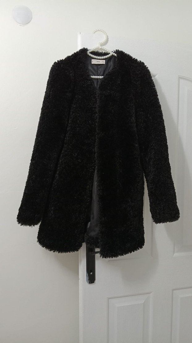 Siyah kürk detaylı, uzun kollu ve notched lapel yakalı, midi uzunlukta, rahat kesim kadın mont. Günlük kullanıma uygun sıcak tutar.
