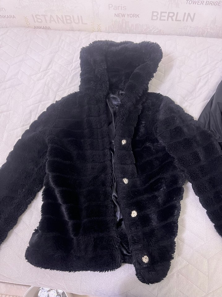 Siyah, kürk detaylı ve uzun kollu bu mont, notched lapel yakası ve midi boyuyla rahat ve gotik bir tarz sunar. Fitted kesimdir. ✨ düğmeleri kopmuş onun dışında bir sorunu yok iç etiketini de rahatsız olduğum için kesmiştim