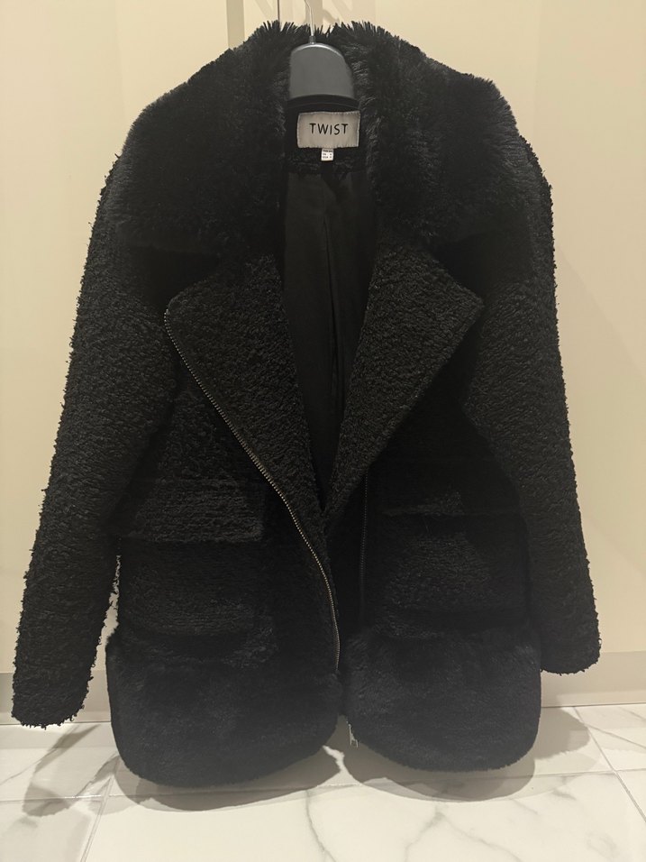 Siyah, kürk detaylı midi uzunlukta ceket. Yumuşak ve sıcak fleece kumaştan, normal kesim, notched lapel yakalı ve uzun kollu. TWIST markası.