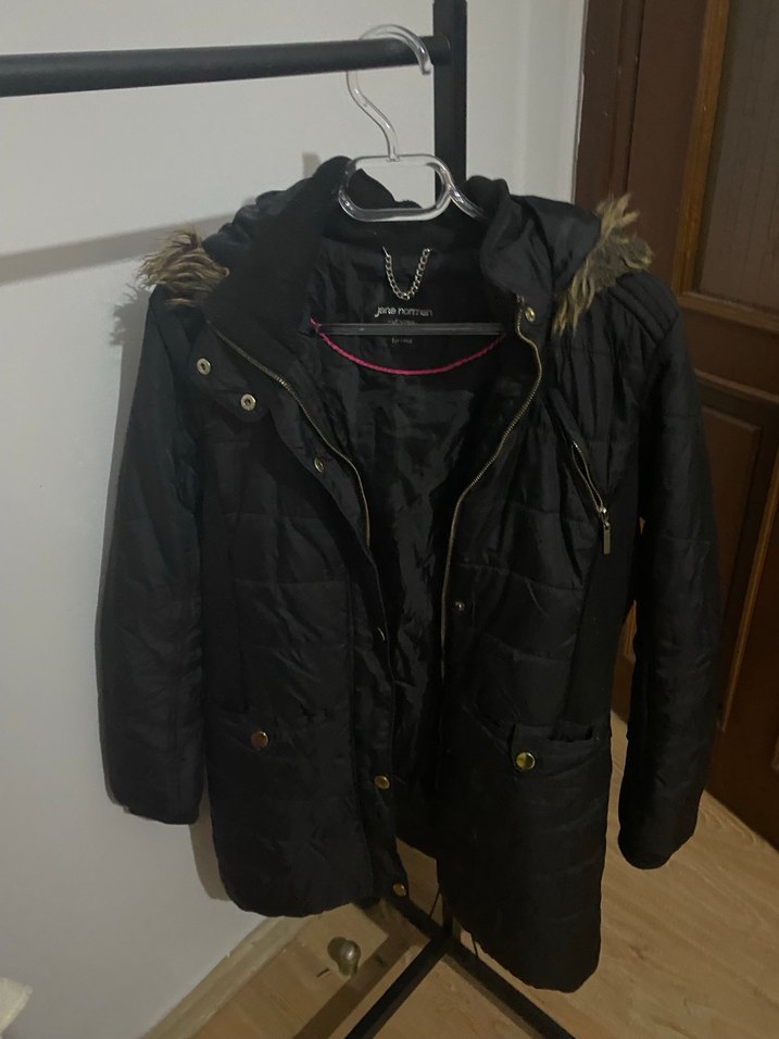 Dar kesim, siyah mont, kapüşonunda kürk detayına sahiptir. Sokak stiline uygun, suni kumaştan yapılmıştır ve günlük kullanım için uygundur.