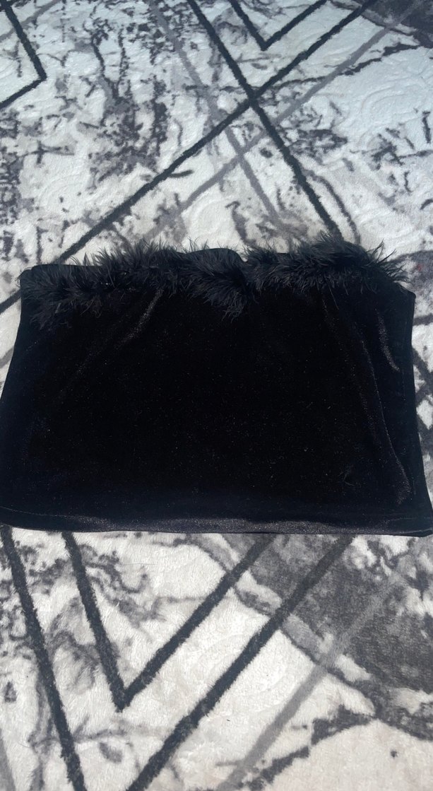 Siyah, kürk detaylı, straplez kollu ve tekne yaka, vücuda oturan midi uzunlukta üst. Gotik tarzda, romantik akşamlar için uygun.