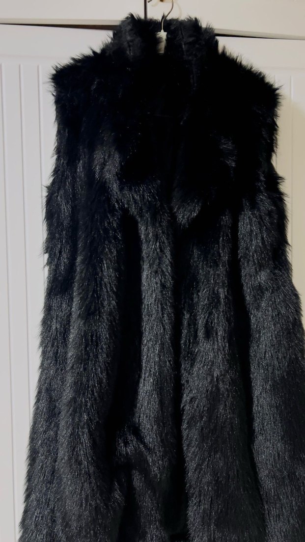 Yumuşak sentetik kumaştan, kürk detaylı, siyah uzun ve fitted kesim kadına özel yelek. Notched lapel yaka ve kolsuz tasarım.