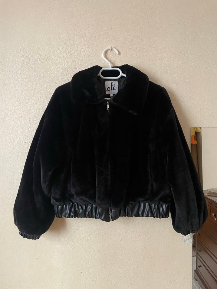 Siyah renkli, kürklü detaylı, uzun kollu, yuvarlak yakalı, bol kesim mini ceket. Yumuşak ve sıcak kumaştan üretilmiştir, rahat ve gotik tarzda.
