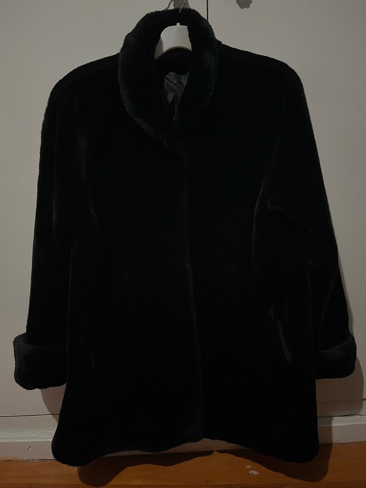 Siyah renkli, kürklü detaylı midi uzunlukta kadın kaban. Notch yaka ve uzun kollu, bol kesim rahat kumaştan üretilmiştir.