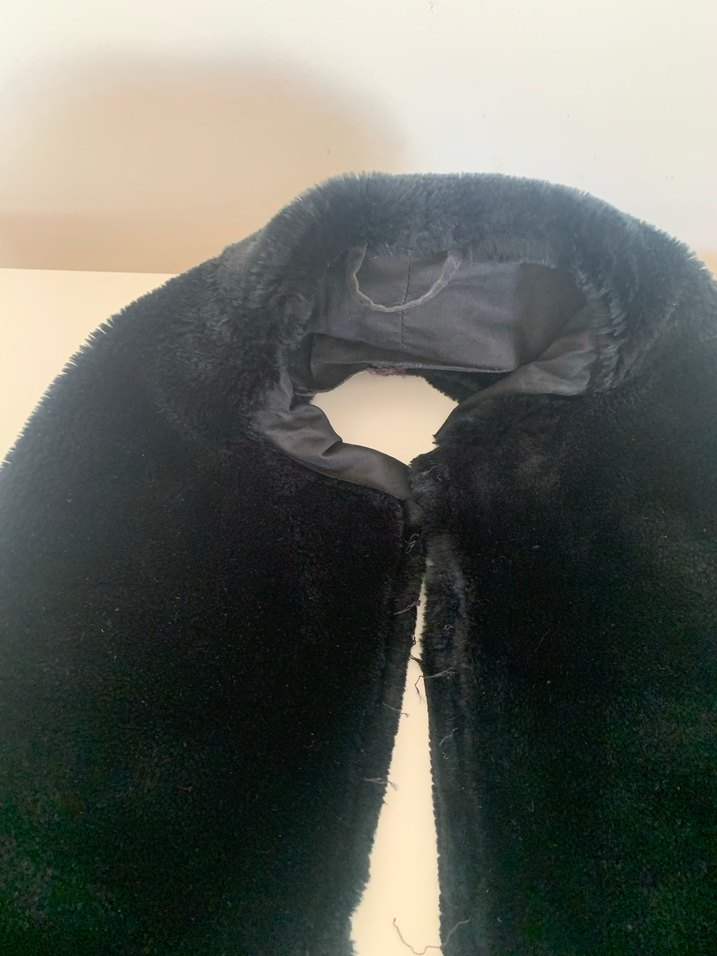 Siyah, uzun, yaka olarak kullanılacak veya süsleme olarak kullanılacak sahte kaliteli kürk parçaları uzun olanı kabanımdan sökerek çıkarttım