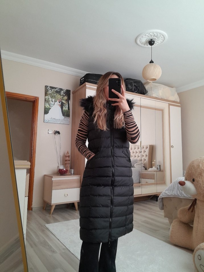 Siyah uzun şişme yelek, fitted kesim, yüksek yaka ve kolsuz tasarıma sahiptir. Kürk detaylı ve sentetik kumaştandır, günlük kullanım için uygundur.
