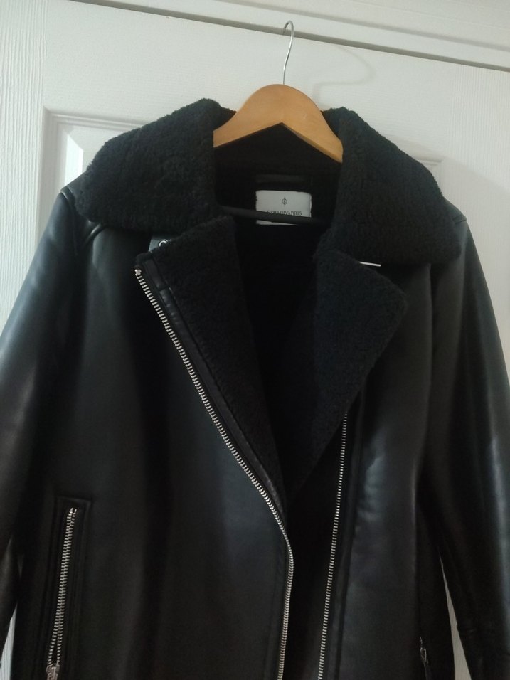 Siyah deri biker ceket, kürklü yaka ve manşet detayları ile fitted kesime sahip. Asimetrik fermuar ve çentikli yaka bulunur. Trendy ve günlük şıklık sunar.
