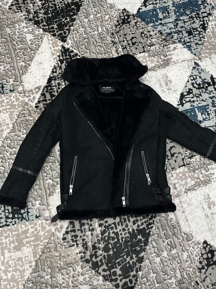 Kürklü yaka ve uzun kollu, siyah renkli, yumuşak ve sıcak kumaştan yapılmış fitted biker ceket. Kısa boyda, desen içermeyen, rock punk tarzına uygun. Fermuar kısımlarının olduğu yerde hafif derisinde dökülme oldu