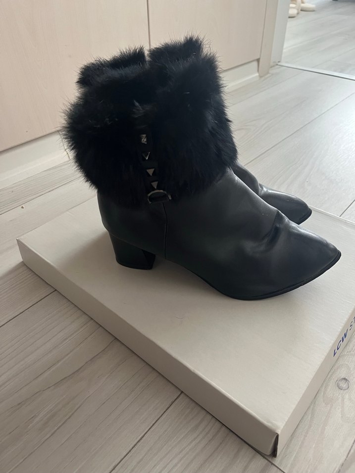 Siyah deri, kürklü detaylı ve blok topuklu kadın botları. Günlük kullanıma uygun gotik tarzda şık tasarım. giyinmediği için dolapta durmaktan önü kırışmış muhtemelen giyince düzelir içi dolunca