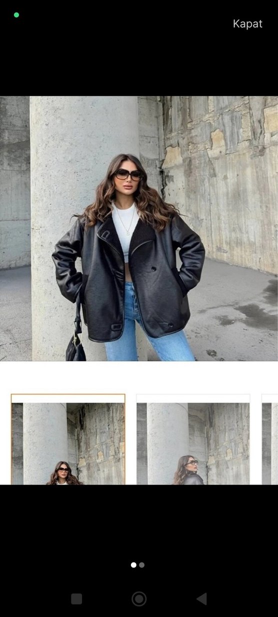 Siyah kürklü deri ceket, kesik yaka ve uzun kollu. Bol kesim, midi boyunda, günlük sokak stili için ideal.